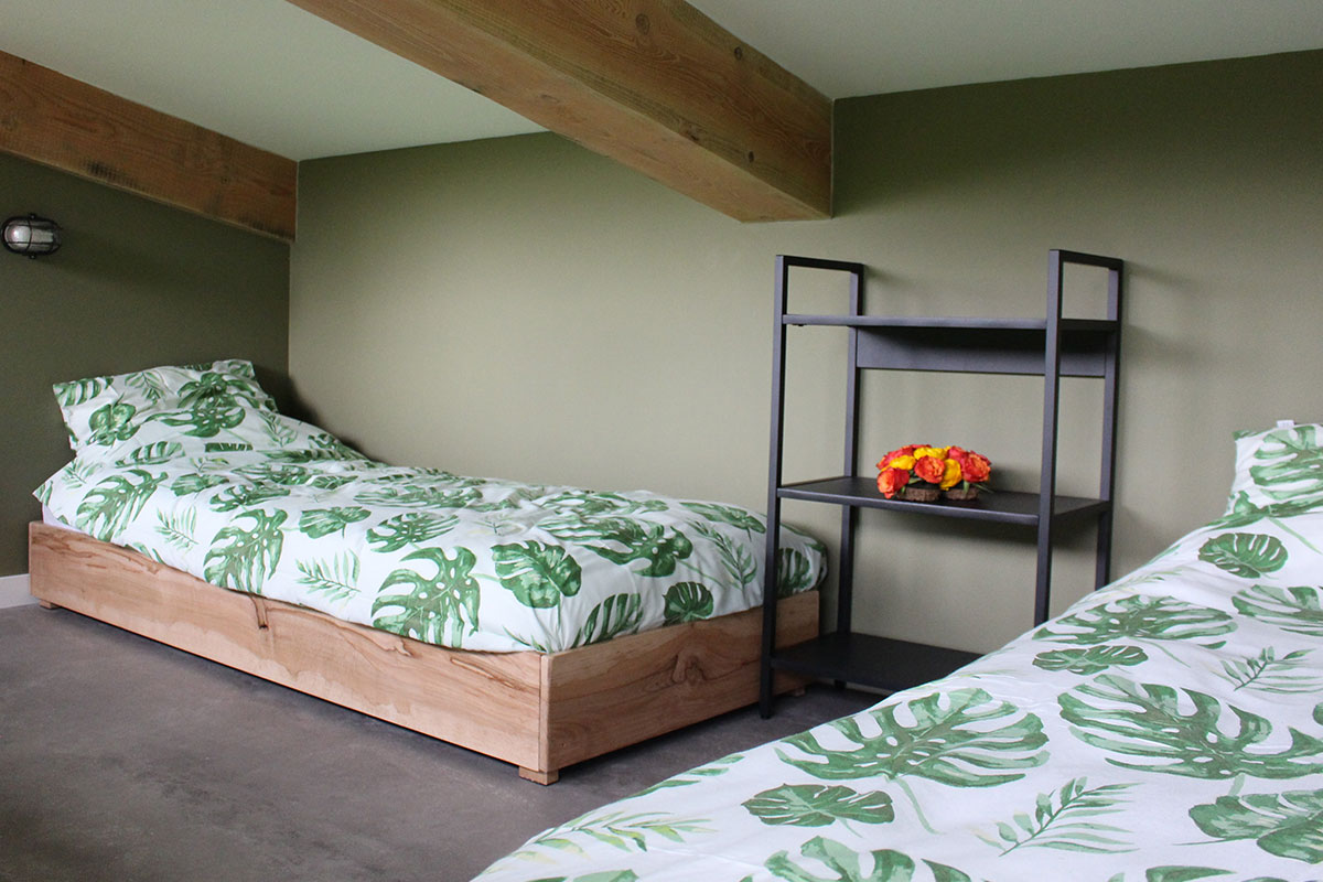 Er is een slaapkamer met een tweepersoons boxspringbed en op de vide vind je twee éénpersoonsbedden, ideaal voor twee kinderen.